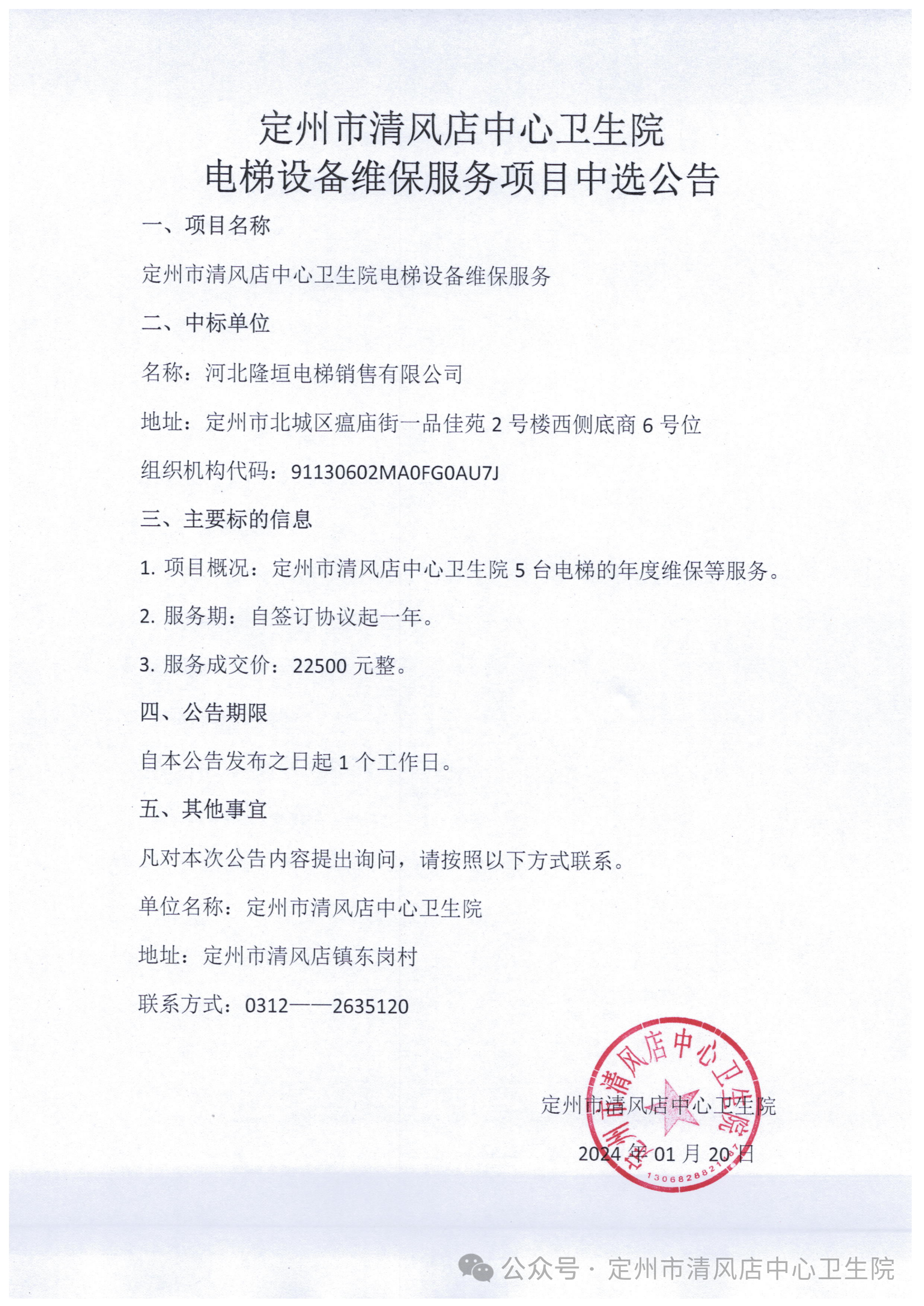 清風(fēng)店中心衛(wèi)生院電梯設(shè)備維保服務(wù)項目中選公告